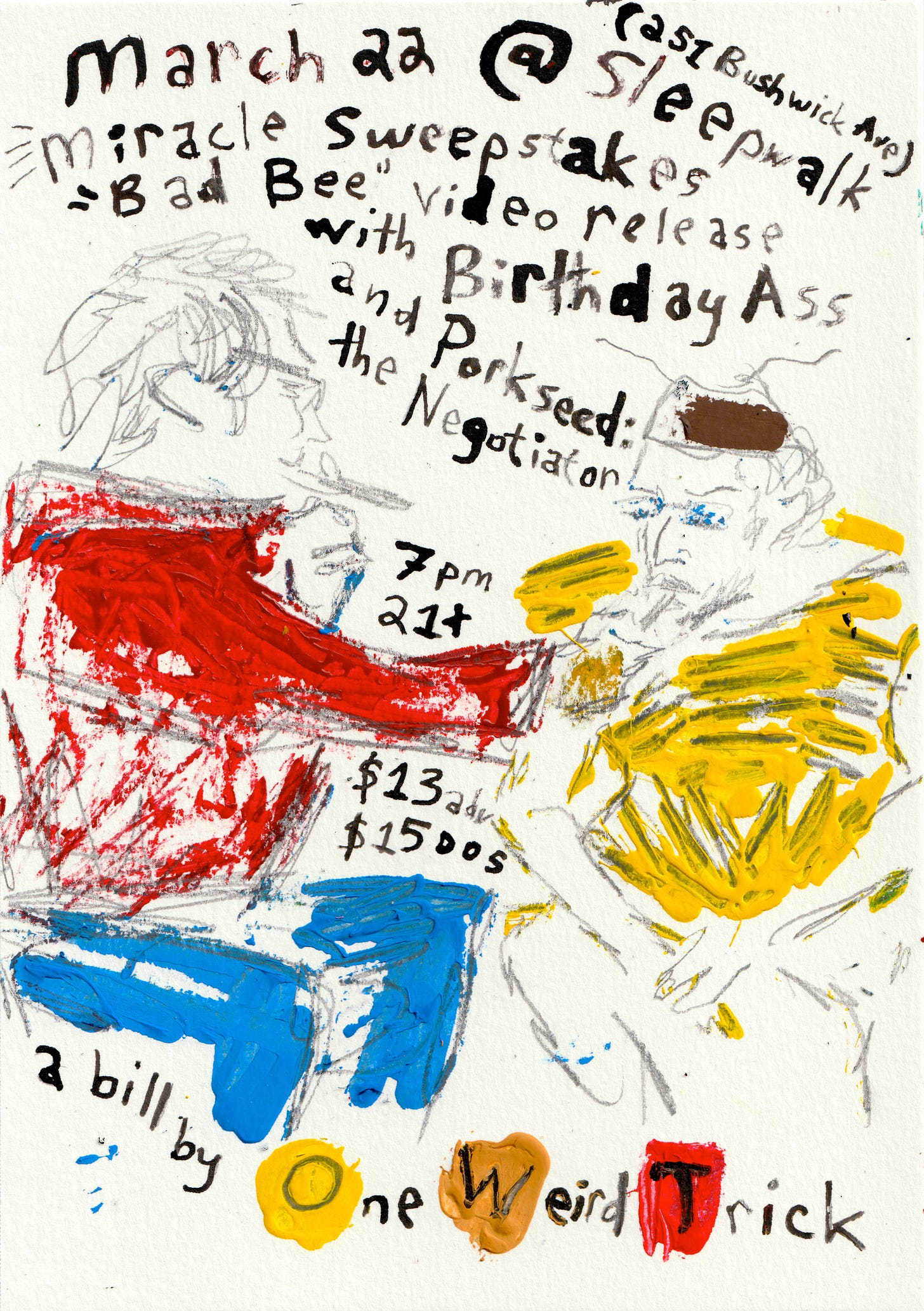 Thanks again to all who came out to the Hit video release last month. And if you’re an Apple Music user, “Nu Jangle” is finally available to stream on there. HBO’s John Wilson was apparently at the show and left either before or during our set. This month, Miracle Sweepstakes has a video release show as well, March 22nd at Sleepwalk (251 Bushwick Ave, you can get advance tix HERE). Who knows which niche celeb will walk out on us this time?