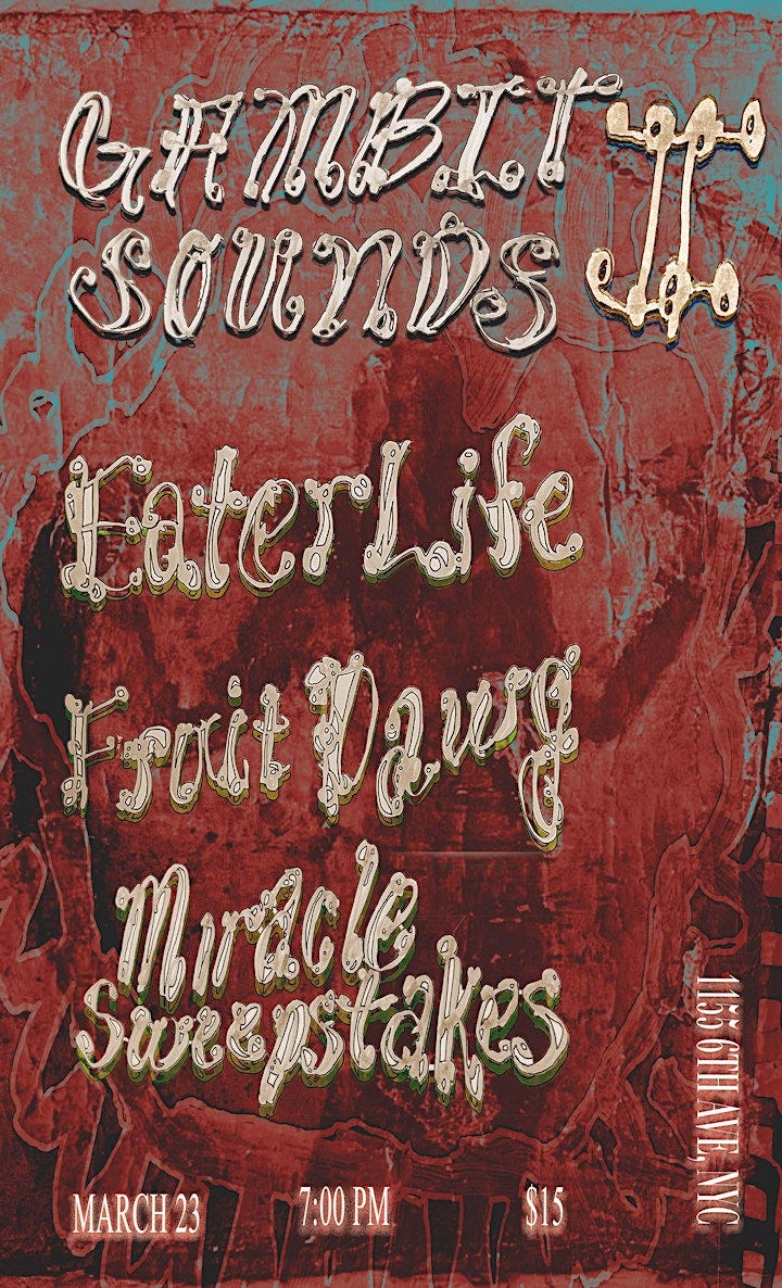 Hope to see you this Friday. But if you can’t make it, you’re in luck— we’re playing another show Saturday. It’s at an art gallery in Manhattan called Gambit Works (1155 6th Avenue). Also on the bill are Fruit Dawg and Eater Life. Flyer below, tix info here.
