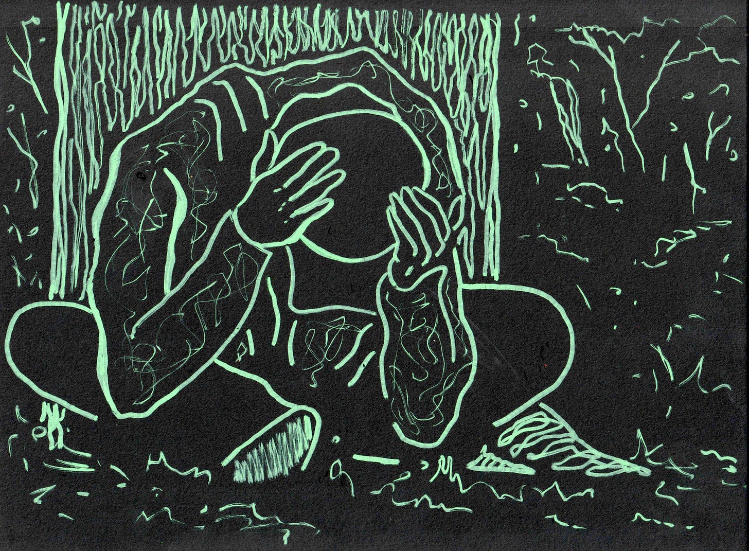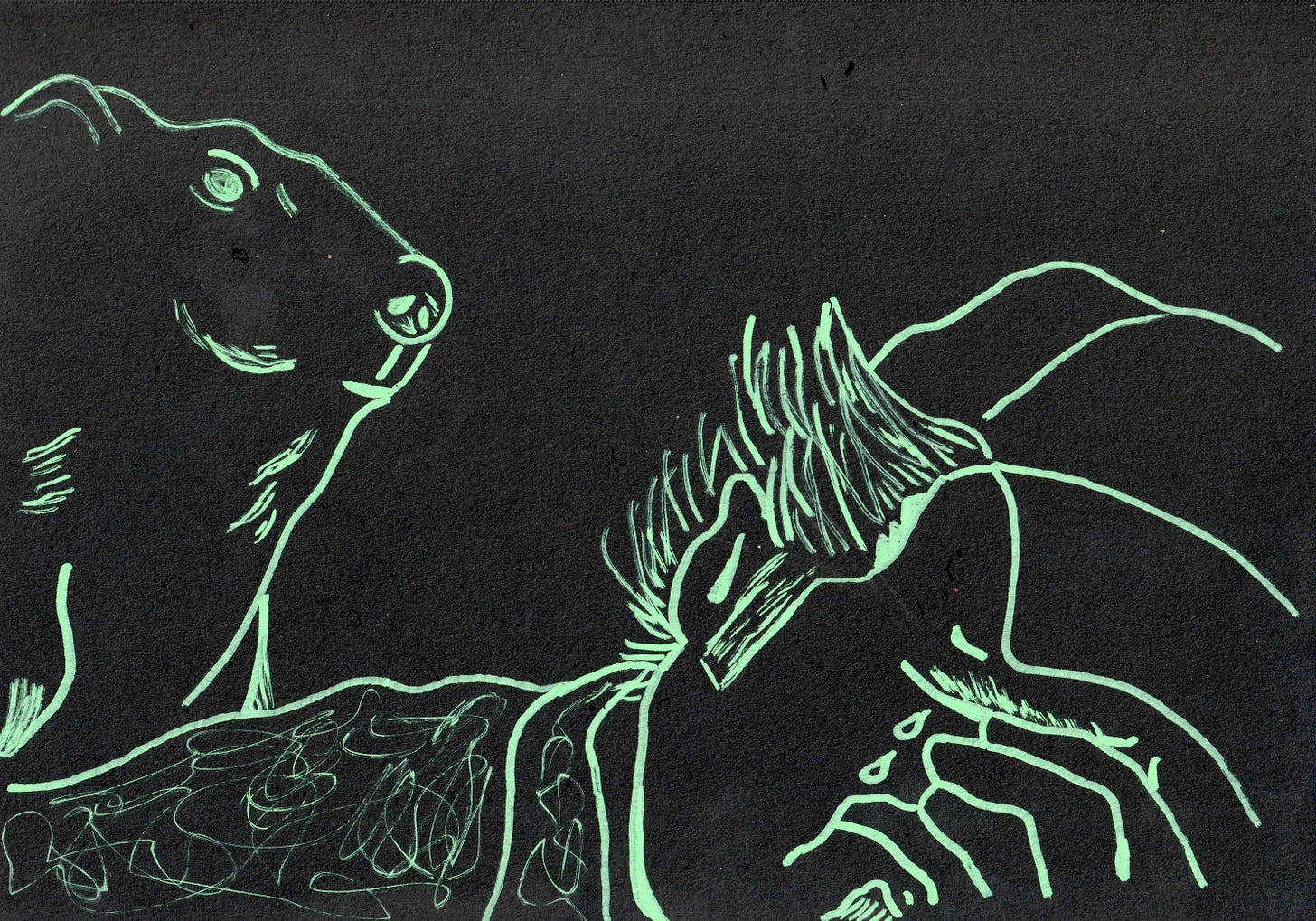 The final drawings were all light green paint pen on black paper, 76 of ‘em in total. Because the storyboard sketches were in pencil, there’s a lot of shading that wouldn’t have looked good with the paint pen, so the main trick to translating them was using stronger, cleaner lines.