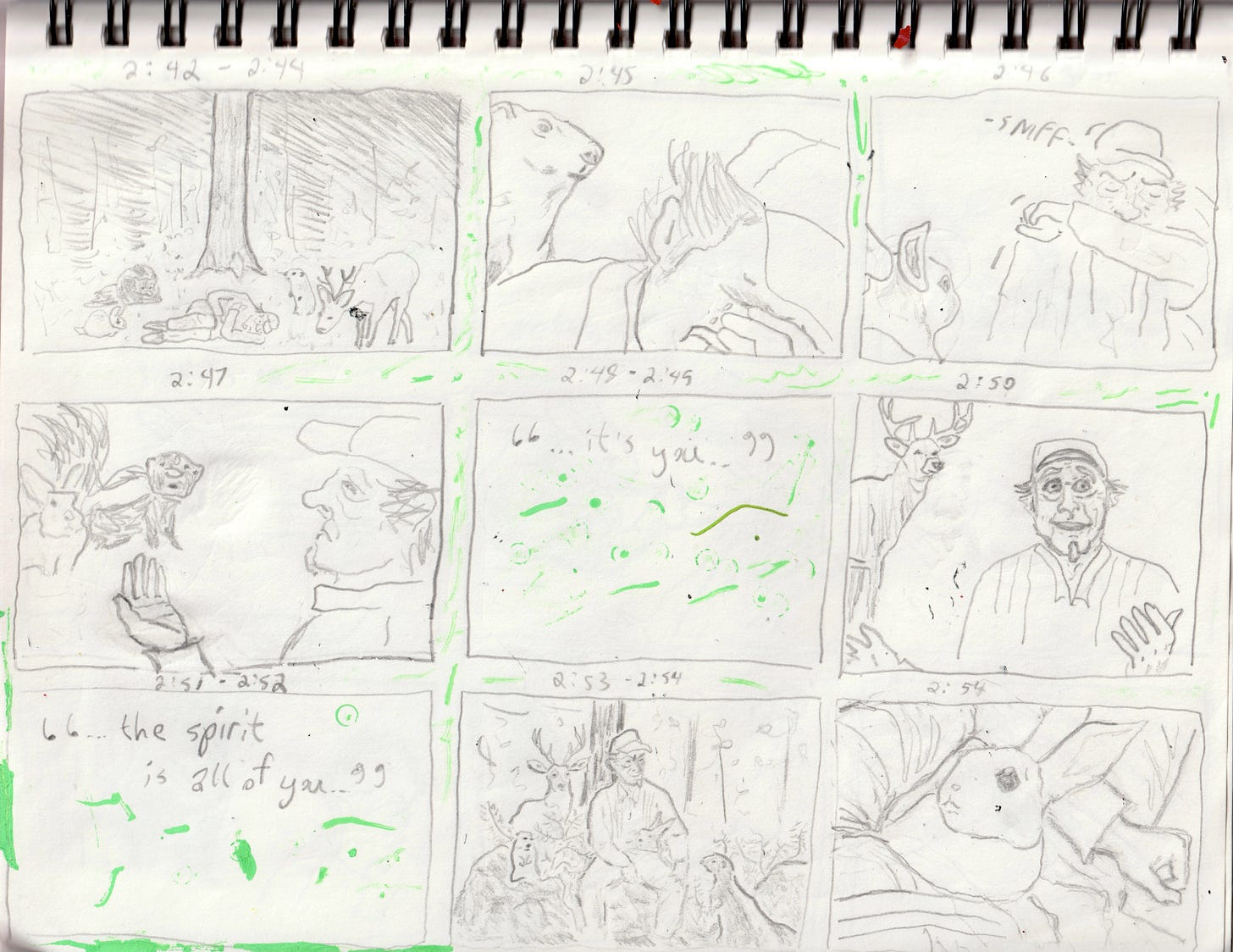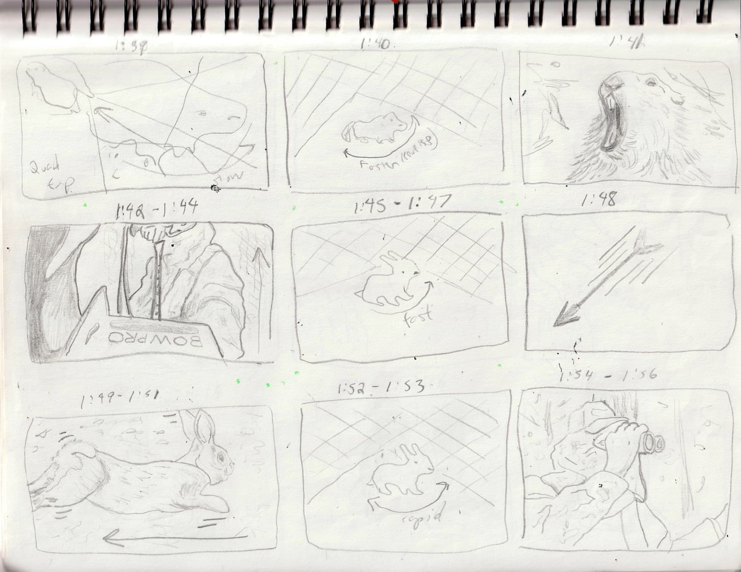 As I mentioned in the last newsletter, the “Nu Jangle” vid is about a bowhunter named Ted Nujangle, who goes critter hunting the woods. Without giving too much away, no cartoon animals were harmed in the making of this video. Since the video concept was a linear tale told in three and a half minutes, I had to storyboard out the whole thing. This was time consuming, and involved watching a lot of admittedly disturbing Ted Nugent hunting videos, but in addition to helping make sure everything fit together, it wound up making the final drawings a lot easier, as I mostly copied these original sketches.