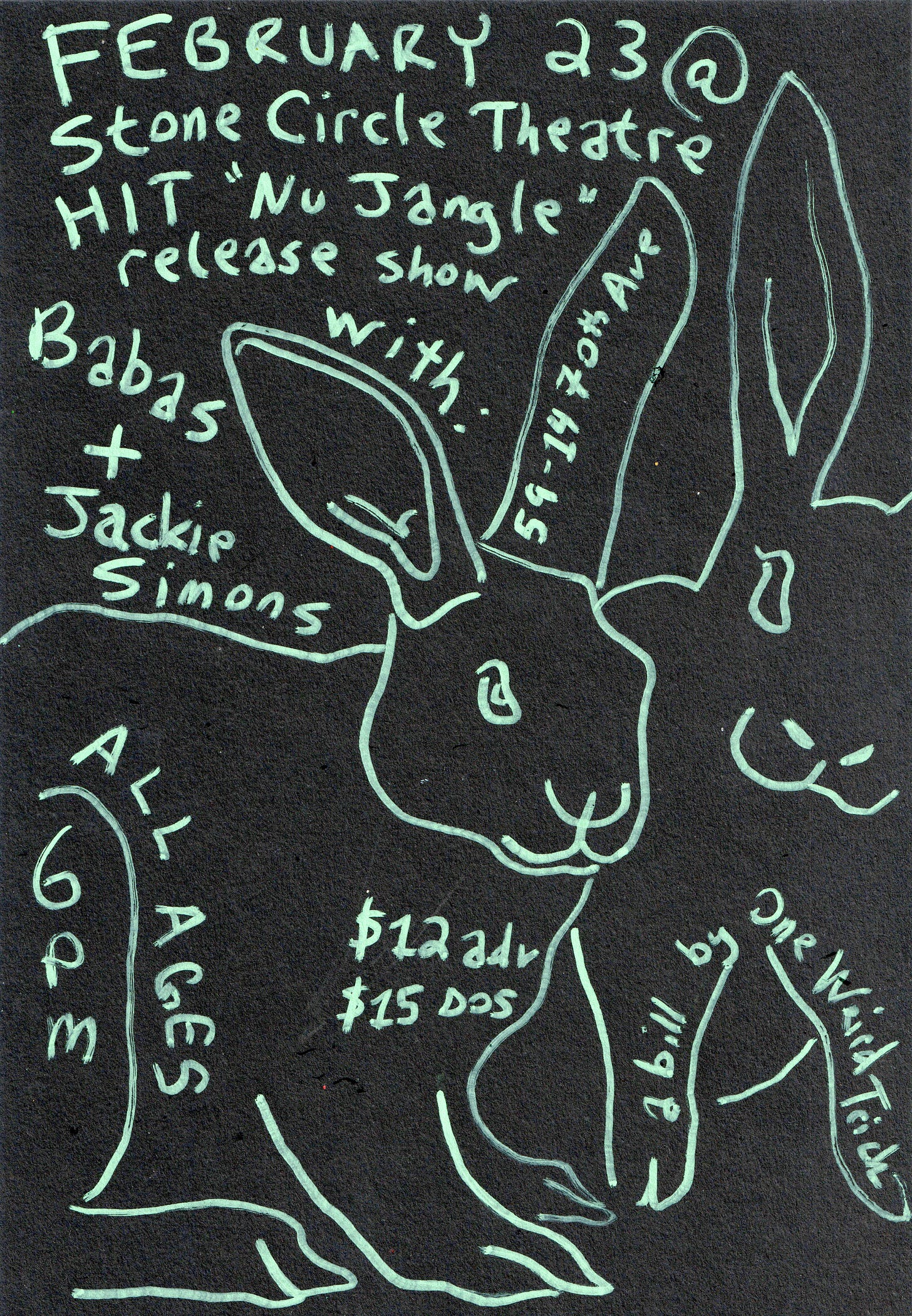 Just shooting out a reminder that this Friday (February 23rd), Hit is playing a very special show at Stone Circle Theatre in Ridgewood (59-14 70th Ave) for the release of our new single and music video “Nu Jangle,” which (small pending technical details notwithstanding) we’re gonna screen at the venue. Also on the bill are Jackie Simons and Babas. This is again ALL AGES, which is ironic given that Friday I will officially be old enough to run for president. It’s an early show, 6:30 doors with a 10pm curfew. You can get advance tickets by clicking this link.
